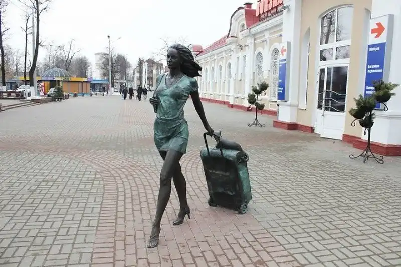 На железнодорожной станции Молодечно в Белоруссии появился постоянный и очень симпатичный "пассажир" - скульптура девушки, везущей за собой чемодан и... котенка на нем. Автор - минский скульптор Вадим Мацкевич. Высота скульптуры - 1 м 96 см, вес - приблизительно 450 кг.