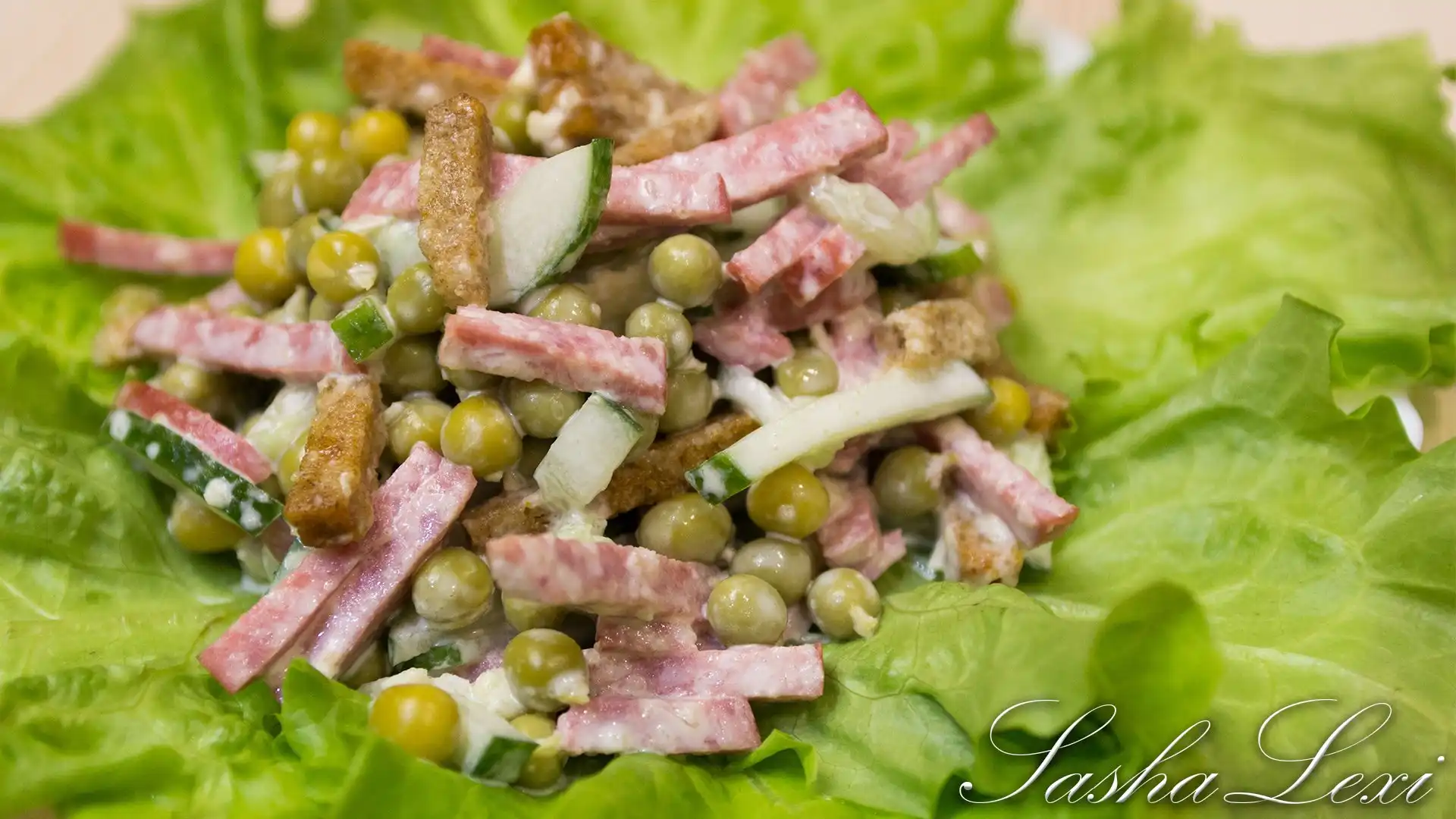 Предлагаю вашему вниманию рецепт супер новогоднего салата с копченой колбасой, сухариками и зеленым горошком. Салат готовится 5 минут.