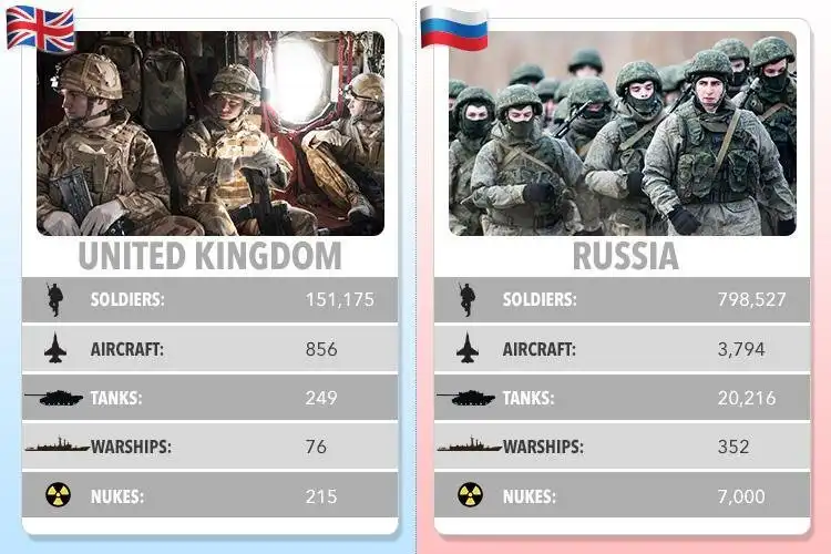 Британцы опасаются военной агрессии со стороны России, глава британской армии предупредили, что Россия может начать войну на Западе "раньше, чем мы ожидаем". В преддверии этих событий на сайте thesun.co.uk решили сравнить статистические показатели армий России и Великобритании. По численности военнослужащих, самолетов, военных кораблей, танков и ядерных боеголовок британская армия уступает российской.