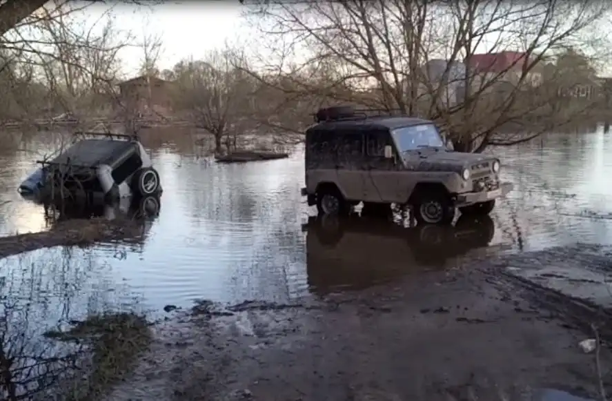 Уазик тянет из воды лебёдкой другой уазик. Нужно отметить что у первого не работает передний мост
