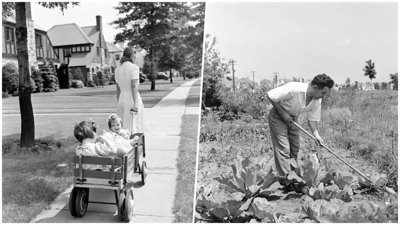В послевоенные годы многие американцы начали переезжать из шумных городов в тихие и спокойные пригороды. Тому способствовали усовершенствованные техники массового производства, которые позволили строить дома гораздо быстрее и дешевле, чем раньше. А так же подписанная президентом Рузвельтом программа помощи вернувшимся ветеранам G.I. Bill, которая предусматривала недорогие ипотечные кредиты и выплаты пособия по безработице.