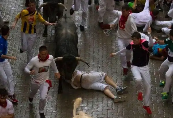Энсьерро (убегании от специально выпущенных из загона быков, коров или телят) в Памплоне всегда считалось опасным мероприятием. Ежегодно тысячи людей в начале июля приезжают на север Испании что бы пробежать по старинным улочкам, подгоняемыми стадом разъяренных быков. Но этот год выдался обильным на трагические инциденты. На старте фестиваля Сен-Фермин в Памплоне бык, проткнув насквозь рогом, убил 38-летнего мужчину. Еще четверо получили серьезные травмы: переломы и вывихи. И без того рискованный забег стал еще опасней из-за дождя, который сделал скользкими вымощенные камнями улицы.