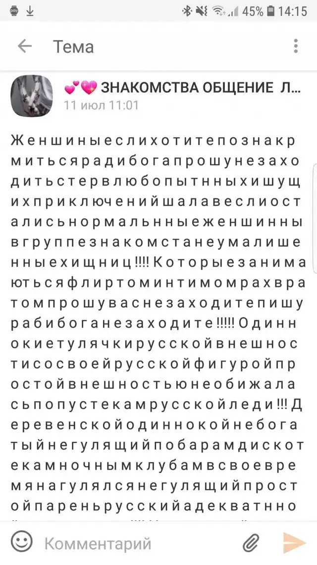 Парень из Тулы дает мастер-класс в поисках терпеливых женщин. Секрет прост - свое сообщение нужно писать с пробелами после каждого символа, не разделяя слова и предложения. В результате, читать получивший текст - сплошная пытка. Осилить его может, поистине, только очень терпеливый человек. Но может именно такая спутница ему и нужна?