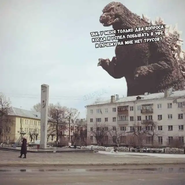 Неназванные художники в ВК с помощью фотошопа показали гипотетическое столкновение Годзиллы с часто встречающимися нашими реалиями.