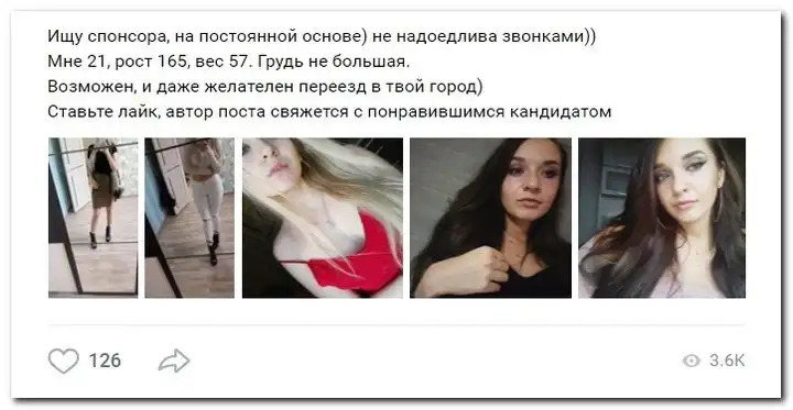 Эти наивные девушки хотят красиво жить и ничего не делать. Они надеются, что богатые спонсоры увидят их красоту, и в очередь выстроятся, предлагая свою помощь. Некоторые даже пишут, что никого интима, им должны заплатить только за приятное общение.