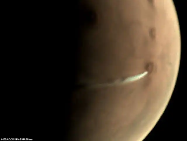 Вулкан Arsia Mons высотой почти 20 км, считавшийся потухшим примерно 150 млн. лет назад, продемонстрировал облака, тянущиеся от его вершины, протяженностью почти 900 км.