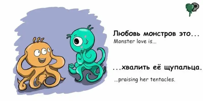 Забавная подборка-пародия на тему вкладышей жвачки «Love is…». Вот только романтика здесь среди монстров и называется несуществующая жевательная резинка «Любовь монстров – это…».