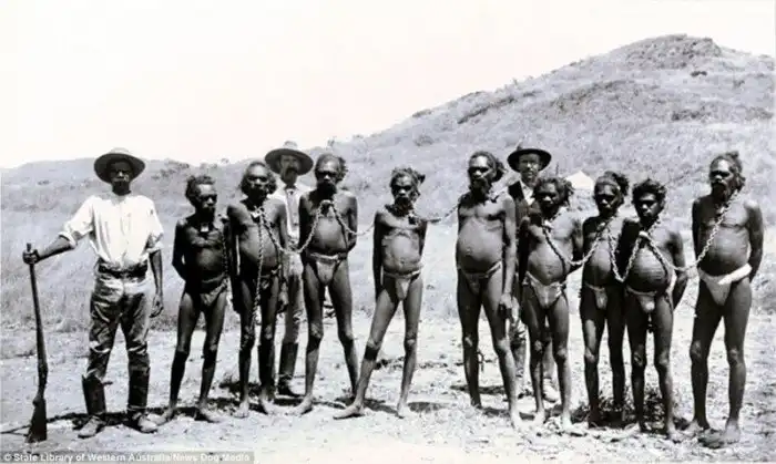 И эти черно-белые фотографии мужчин-аборигенов, выстроенных в очередь, скованных тяжелыми цепями и охраняемых белыми людьми, вооруженными винтовками, являются одним из многих свидетельств жестокого обращения с коренными австралийцами. Прибывшие в 1788 году колонисты изгнали аборигенов с их земель, что привело к гибели части культур и расслоению в обществе. Англичане завезли болезни, против которых у местного населения не было иммунитета. Эпидемии и алкоголь окончательно добили их.