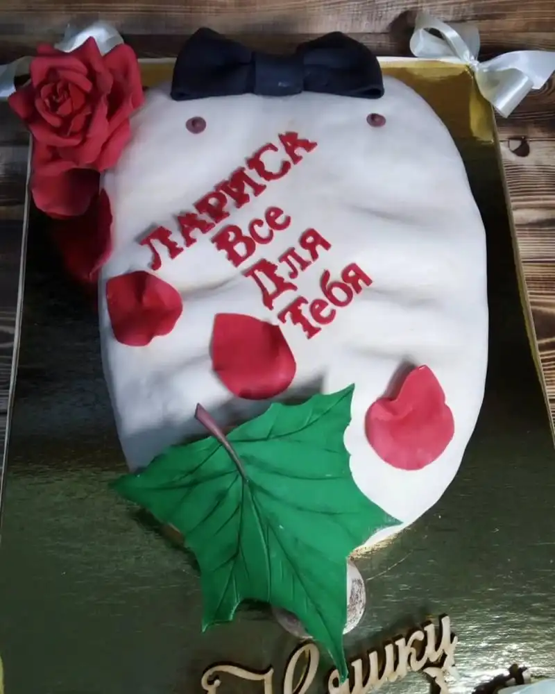 Калужанке Ларисе стукнуло 30 лет, и ее подруги преподнесли ей торт, но не простой, а сюрпризом. Изюминка подарка в виде мужского торса скрывалась под кленовым листом. Пожелания подруг предельно понятны.