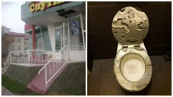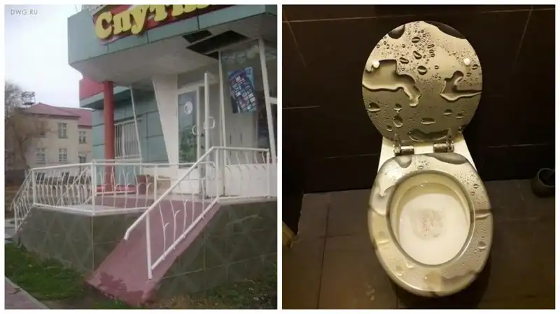 Когда видишь такой полет инженерной и дизайнерской мысли, становится даже как-то спокойнее на душе: мол, я-то еще ничего - по сравнению с некоторыми. Как минимум, не я придумал разместить пандус для инвалидной коляски под наклоном в 45 градусов. Да и стульчак унитаза в модном стиле "брызги" - не мое детище.