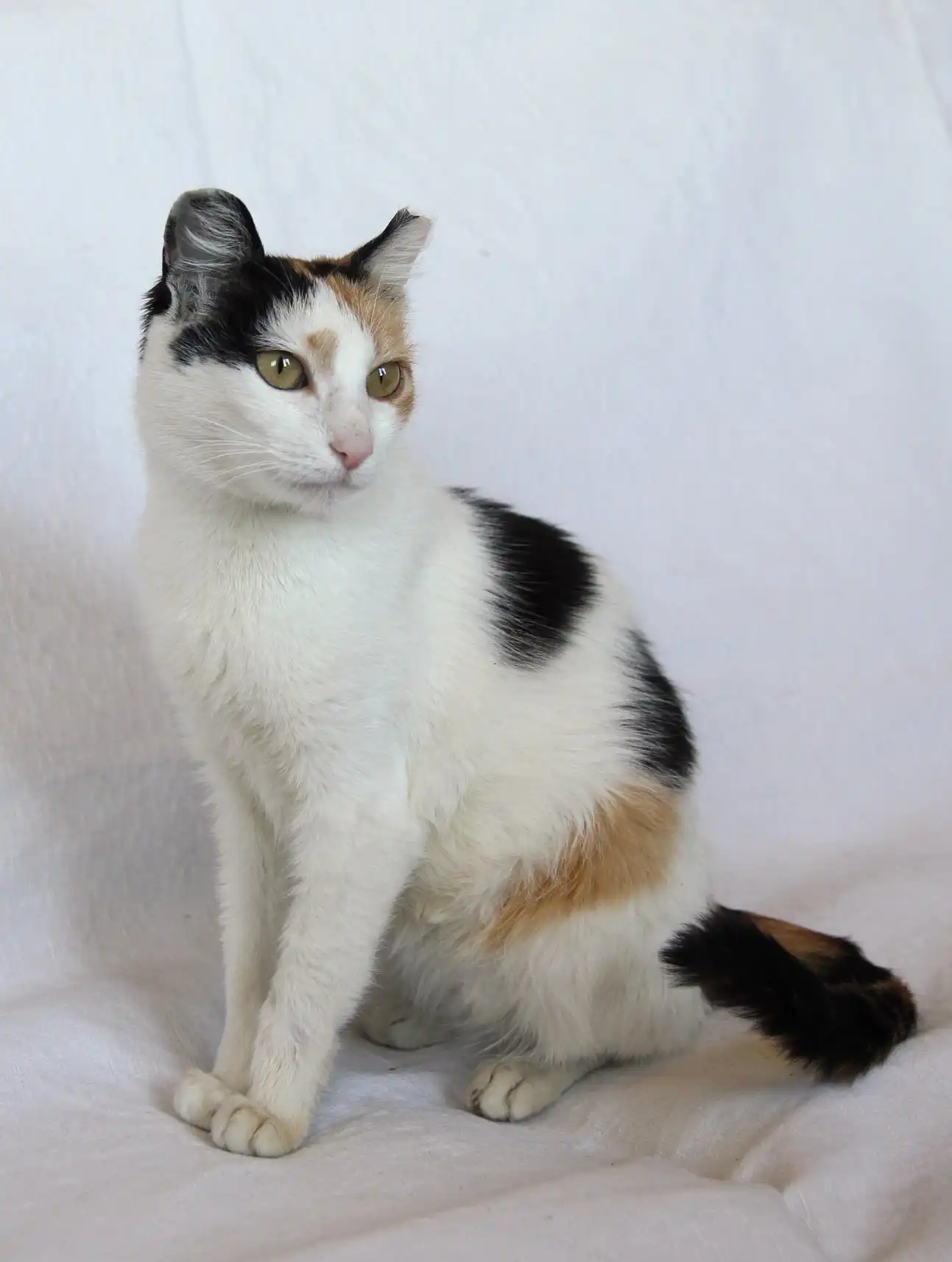 Кошка Шарлотта, возраст примерно один год, трёхцветная с белым животиком. Найдена на улице, одно ушко обморожено. Очень милая добрая, ласковая, нежная девочка. Питается готовыми кормами, пользуется лотком. Стерилизована. Телефон 89234102417 ( звонить после 16-00)