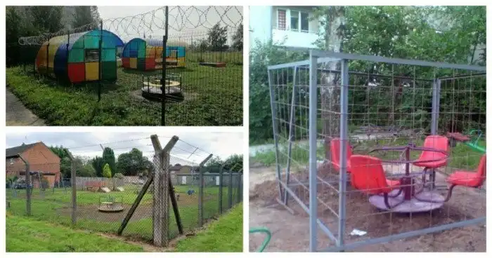 Некоторые полагают, что это детские площадки защищают от вандалов и извращенцев. Но по факту места пребывания детей обносят колючкой, чтобы хоть как-то обезопасить себя от малышей и малышек.