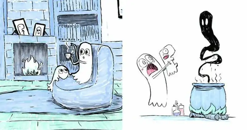 Inktober ("Чернильный октябрь") - это ежегодный конкурс в Инстаграме, придуманный иллюстратором Джейком Паркером. Правила просты: каждый день в течение октября нужно делать один рисунок чернилами. Художник Sow Ay выполнил эти правила и нарисовал забавную историю приключений двух персонажей: привидения Томи и его собаки по кличке Призрак.