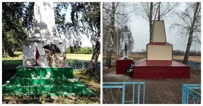 Памятник погибшим воинам Великой Отечественной Войны в деревне Спасские Мурзы под Саранском, местные власти просто покрыли сайдингом и профлистом.