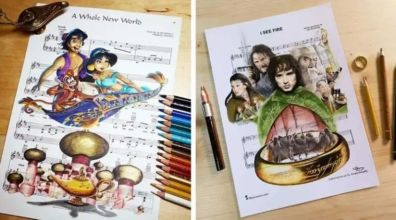 Австрийская художница Урсула Даути (Ursula Doughty) решила показать свои творческие задатки весьма необычным и увлекательным способом — она взяла ноты с известными песнями и нарисовала на них разные интересные сценки с известными персонажами и знаменитостями. Стоит признать, что музыкальные композиции и рисунки довольно часто взаимосвязаны, что добавляет больше глубины и многослойности художественным работам Урсулы.