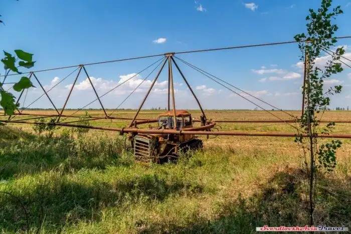 В районе города Саки, в поле был замечен трактор ДТ-75М (точнее его остатки), производства ПТЗ (Павлодарский тракторный завод) с дождевальной установкой ДДА-100.