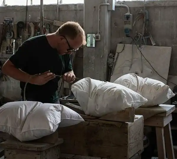 С помощью пневматического молотка и различных инструментов для резьбы он превращает мраморные блоки в бюсты, фигуры и даже подушки.