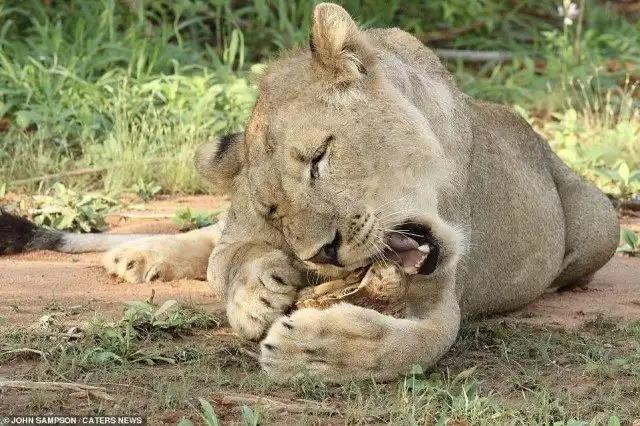 В Парке Замбии львица поймала черепаху и решила ей полакомиться, но не тут то было.