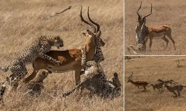 Редкий случай удалось заснять британскому фотографу Кевину Руни в кенийском национальном парке Набоишо. Самец импалы, которого атаковали сразу пять гепардов, вопреки всему сумел вырваться на свободу!