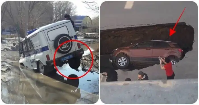 Весной автолюбители сталкиваются с типичной проблемой - дороги размыло. После зимы, как подснежники, расцветают на асфальте ямы. Иногда они скрываются под лужами, тая настоящую опасность для водителей. Мы собрали примеры того, как внезапно авто может угодить под землю на ровно месте. Остается только вспоминать детскую присказку: "В ямку - бух!". Будьте аккуратны на дорогах!
