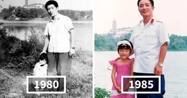 Хуа Юнкин из Чжэньцзяна в китайской провинции Шаньду каждый год на протяжении 40 лет фотографируется с дочерью на одном и том же месте. Эта фотолетопись - наглядная иллюстрация того, как бежит время.