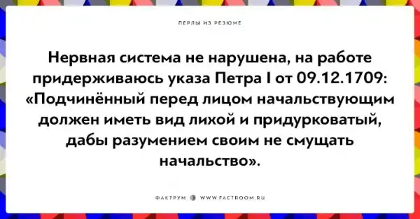 Порой на стол специалистов по подбору персонала ложатся такие шедевры, что просто невозможно не расхохотаться! Видно, что авторы старались показать себя во всей красе и мыслить нестандартно. Публикуем два десятка таких оригинальных перлов.