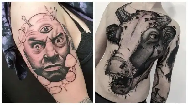 Эти татуировки - прекрасные примеры ужасного вкуса, но вполне приличного исполнения. Выполнены они в целом профессионально, но эстетическая составляющая оставляет желать лучшего. И главный вопрос - как кому-то пришло в голову нарисовать на себе такое?