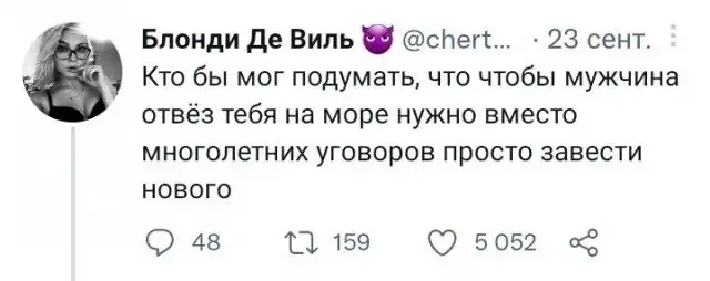 "То есть мужик, по сути, все правильно сделал. Вывез ее в отель, где 10 дней тупо будет её *б*ть без всех этих походов по ресторанам/магазинам. Красавчик.