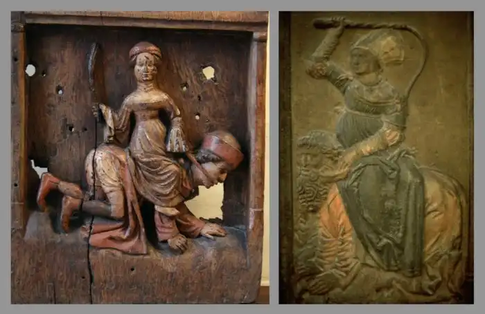 Эта история об Аристотеле и капризной женщине была популярна в Средние века из-за своего явного неприличия. Посмотрите, как часто и с каким удовольствием изображали этот сюжет художники!