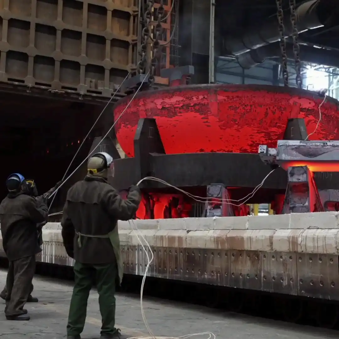 Сначала 64-тонную кованную стальную заготовку разогнули в лист. Затем изделие нагревали в три ступени на протяжении 6 часов (максимальная температура – 1020 °C). Далее с помощью крана заготовку переместили на штамповую оснастку и применили пресс с усилием 10 000 тонносил.