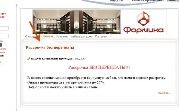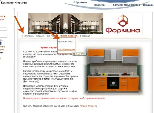 Ниже пример мини-сайта компании “Формика” на котором видны вкладки и выплывающее меню: