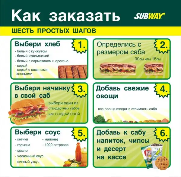 В ресторанах «Сабвэй» нет кухни, то есть весь процесс приготовления сэндвичей и салатов проходит прямо у Вас на глазах! Кроме того, Вы сами участвуете в нем!