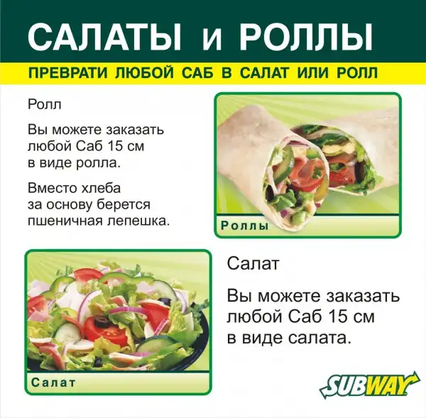 Кроме Сабов в «Сабвэй» вы также можете заказать ролы, салаты, супы и разнообразные напитки!