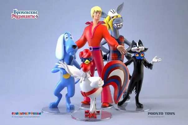 Герои популярного советского мультипликационного мюзикла "Бременские музыканты" (1969) и его продолжения "По следам Бременских музыкантов" (1973), по мотивам сказки Братьев Гримм.