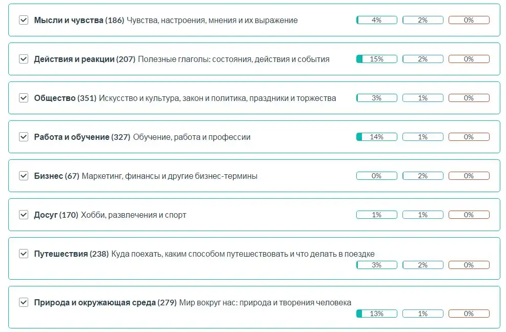 Если Вас пугает объем слов и фраз, у нас приятные новости: они все разбиты по тематическим блокам, до 300 единиц. Примеры тем: английский для путешествий, английский для деловой жизни, устойчивые выражения и так далее.
