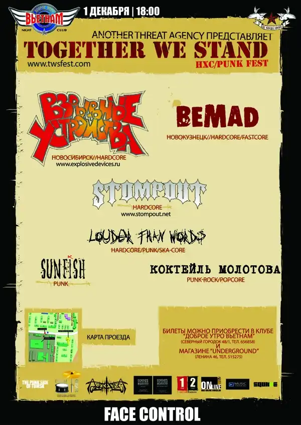 TOGETHER WE STAND hardcore/punk FESTВзрывные Устройства Хардкор-банда из Новосибирска. Существует с середины 90-х гг. Пережила огромное множество смен составов, постоянным участником оставался только гитарист Талиб. В 2006 году у группы вышел альбом "Четкая Грань" на лейбле Sound Age prod.