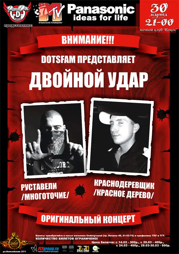 30 марта в клубе КОКОС (Енисейская 37/1) состоится единственный в Томске концерт групп МНОГОТОЧИЕ и КРАСНОЕ ДЕРЕВО с оригинальной программой Двойной Удар.