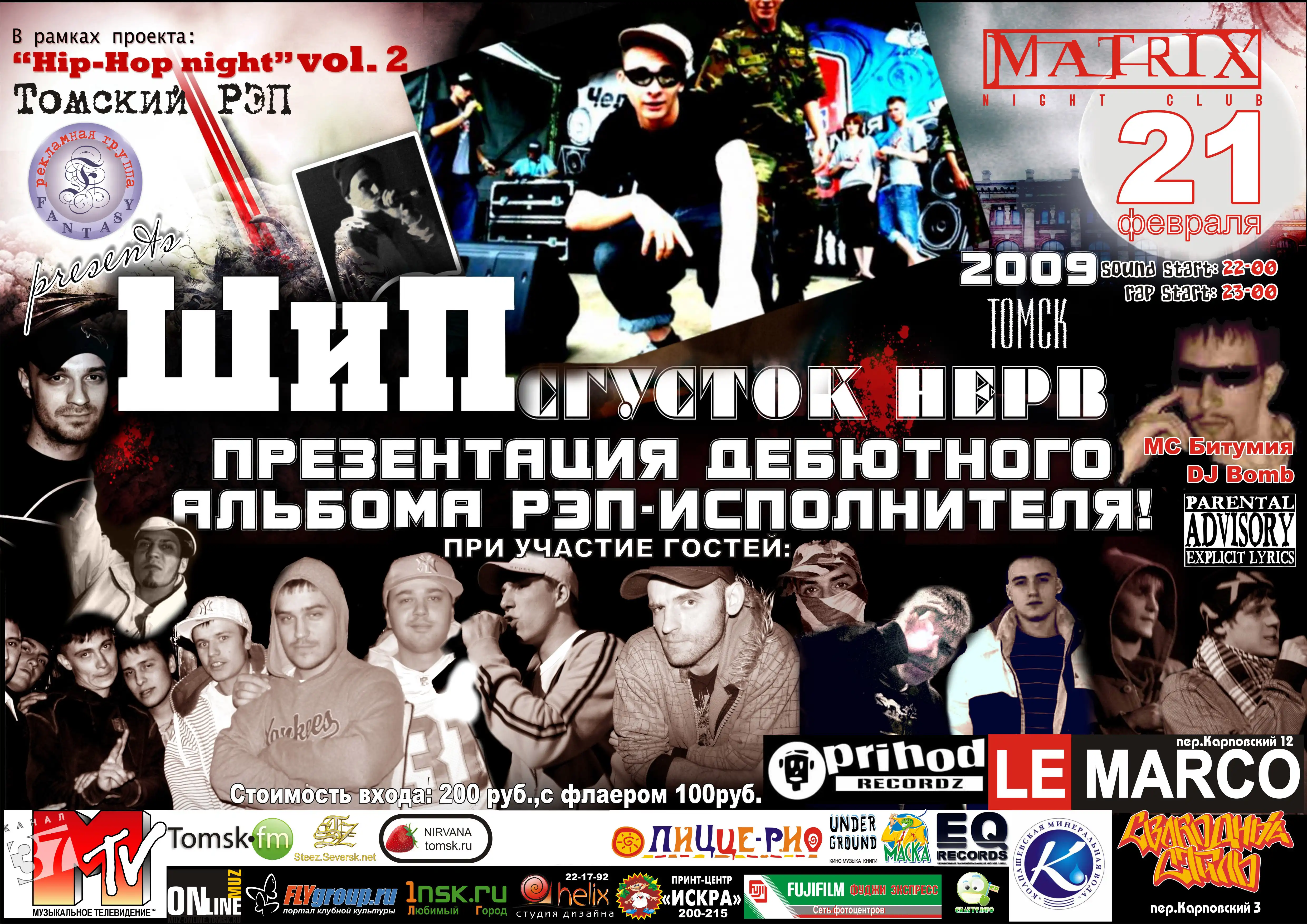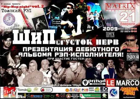 21 февраля в 22 00 в НК "Матрица"состоится презентация дебютного альбома рэп - исполнителя Шип'а [Сгусток нерв 2009] в рамках проекта "Hip - hop night"vol#2 при участии приглашённых гостей: