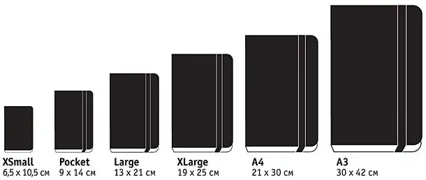 Блокноты Молескин имеют широкий диапазон форматов: от самых компактных и миниатюрных 6,5х10,5 см (XSmall) до формата А3.