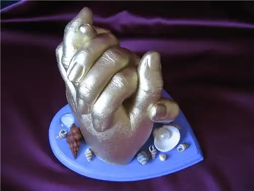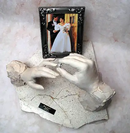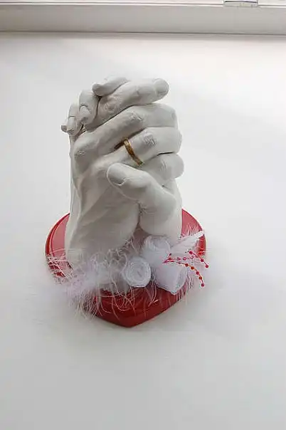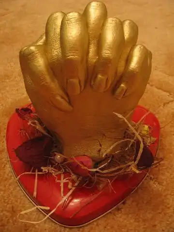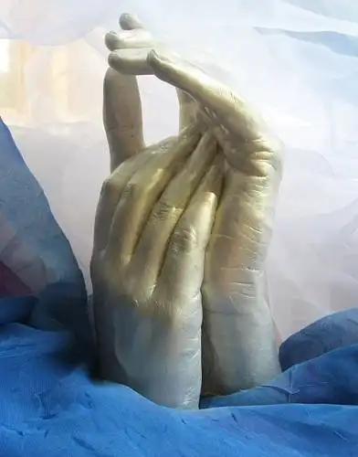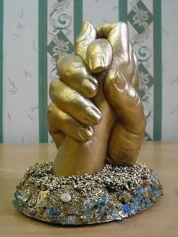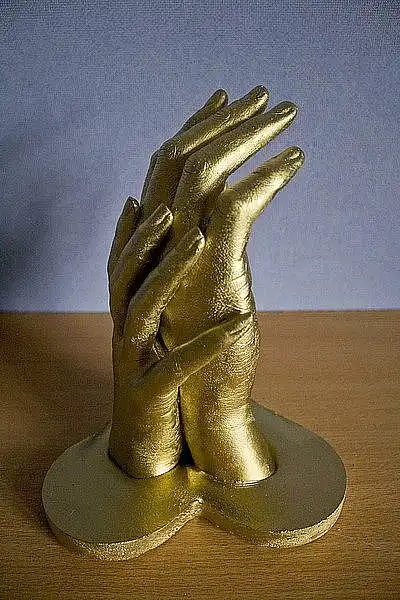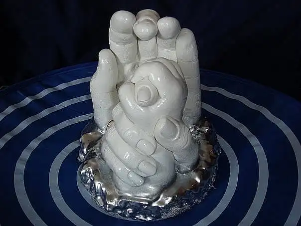 Так называемую композицию «Свадебные руки» можно заливать непосредственно в день бракосочетания. Уникальный процесс занимает две минуты, материалы не пачкаются. Это является символом соединения молодоженов в крепком союзе, их искренность сердец и тепло рук, которые держат семейное счастье. В скульптурной копии будут видны свадебные кольца. Эффект потрясающий! В качестве подарка подобная композиция будет очень актуальна.