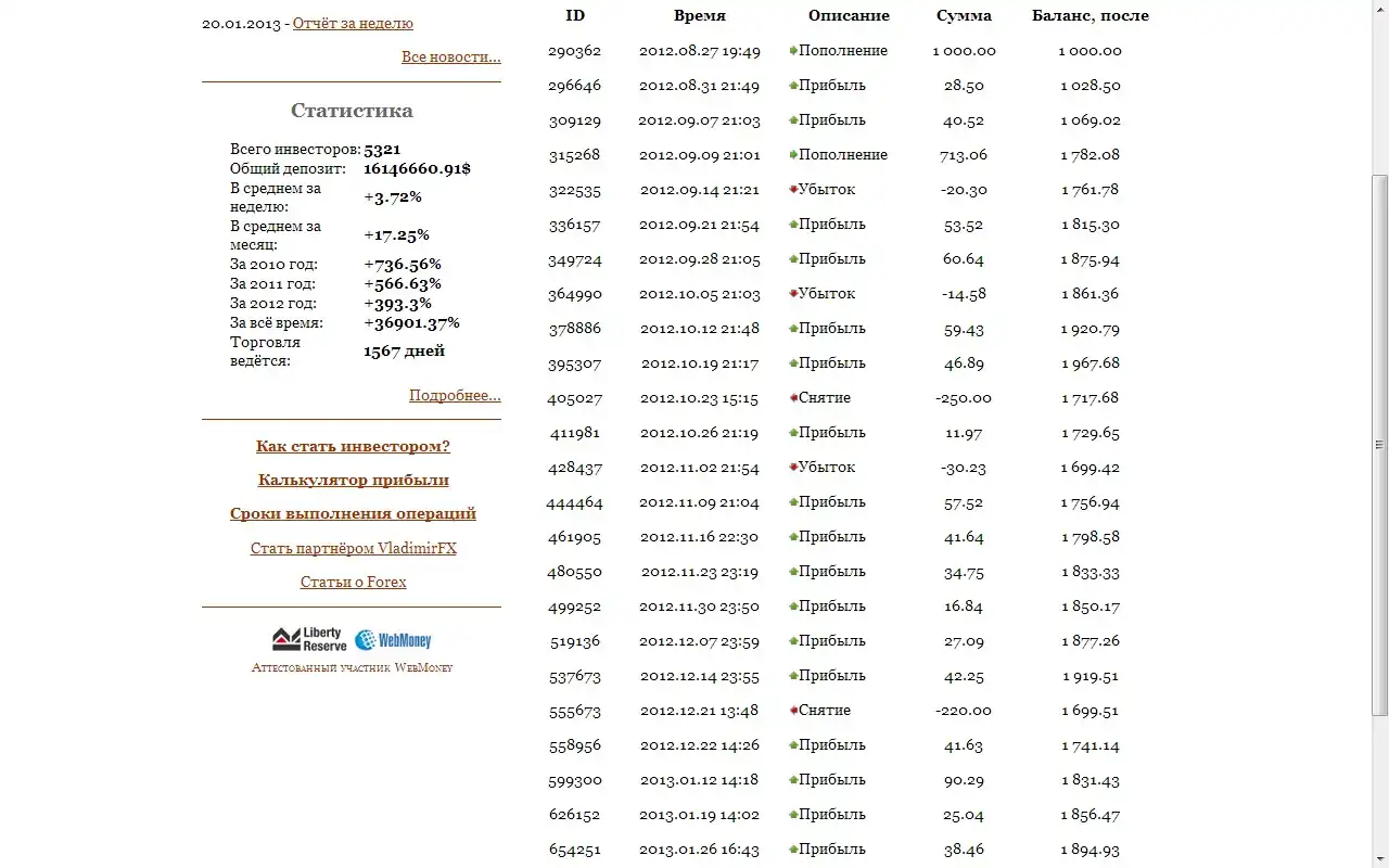 Прежде чем предлагать вам инвестиции, мы самостоятельно сделали вложение $1700 долларов в августе 2012 года. Результаты данного эксперимента вы можете посмотреть на копии экрана нашего личного кабинета ниже:
