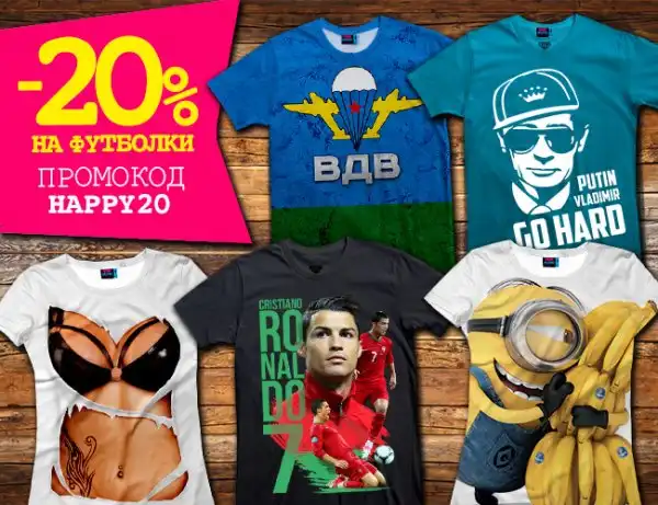 1) Скидка 20% на все футболки по промо-коду HAPPY20;