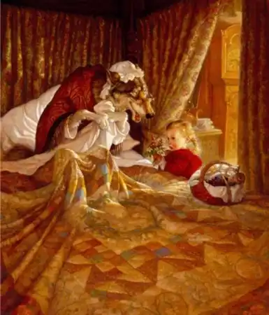 Однажды мать ей сказала: «Красная Шапочка, возьми пирожок, горшочек маслица и бутылочку винца и отнеси это бабушке». «Нет, — отвечала Красная Шапочка. — Буду сидеть у окна, прекрасного принца ждать».