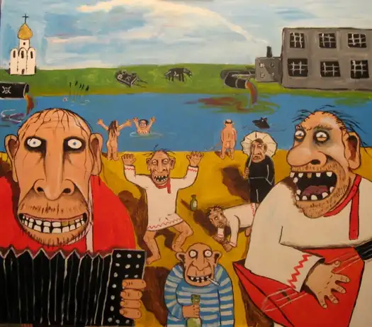 В России отсутствует культура, искусство и кинематограф. Я приобрёл одно произведение - яркий пример дегенаративного творчества местных жителей – вот эту картину "художника" Васи Ложкина.