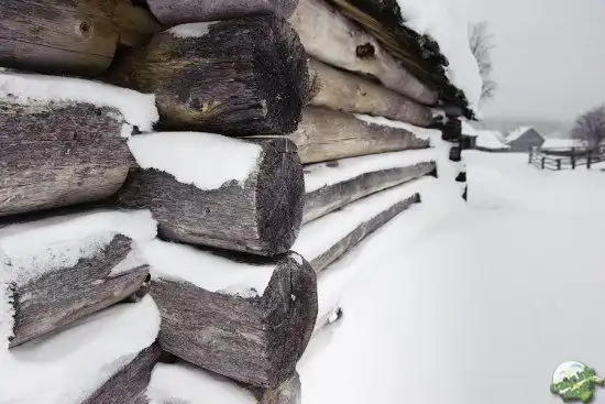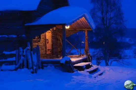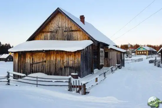 7. В деревне пару лет назад открыли магазин, только вот посмотреть, что же там продают, нам так и не довелось: хозяйка лавки уехала пополнять запасы, и до нашего отъезда не вернулась. Недалеко от магазина стоит вышка со здоровенной спутниковой тарелкой на вершине. Внизу к бревнам вышки прикручена ярко-синяя телефонная будка, резко контрастирующая с белым безмолвием.