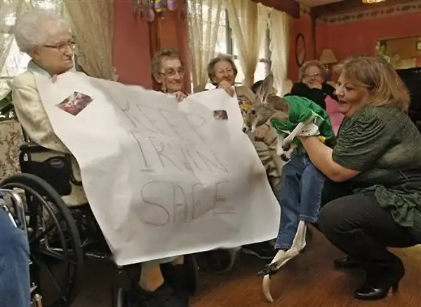 Кристи Карр держит на руках своего кенгуру по кличке Ирвин во время визита в дом престарелых городка Брокен-Эрроу. Из-за травмы спины Ирвин частично парализован, поэтому Кристи обычно носит его на руках, заботясь о нем как о ребенке.