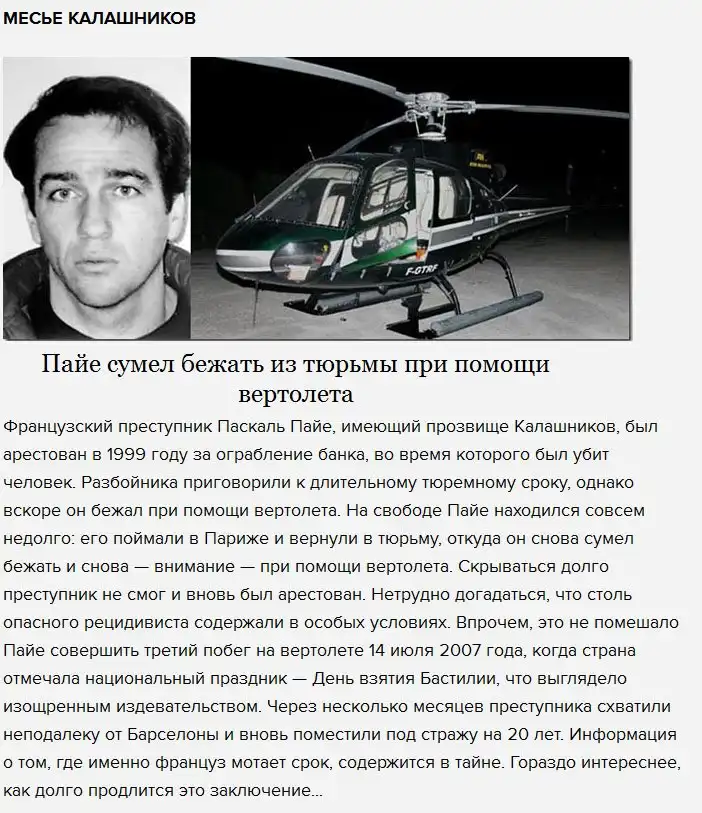 Французский рецидивист Паскаль Пайет по прозвищу Калашников прославился благодаря самому голливудскому сценарию побега. Вновь загремев в тюрьму после двух удачных побегов, Пайет задумал кое-что покруче банальных подкопов и переодеваний в охранника. В июле 2007 года, когда Франция отмечала День взятия Бастилии, на крыше тюрьмы Грасс французского города Люне, где он отбывал наказание, приземлился угнанный в Каннах вертолет. Из кабины выскочили трое мужчин, размахивая оружием, вбежали в здание тюрьмы, захватили с собой Паскаля и улетели в неизвестном направлении. Три месяца спустя преступника вновь задержали в Испании, но в историю он уже вошел.