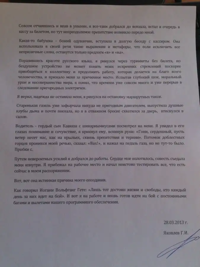 Поэтому объяснительную он написал также от всей души с порывом эмоций :)