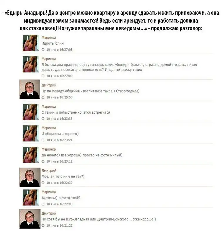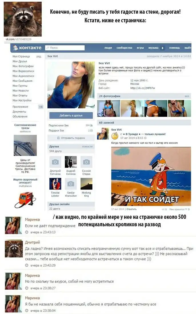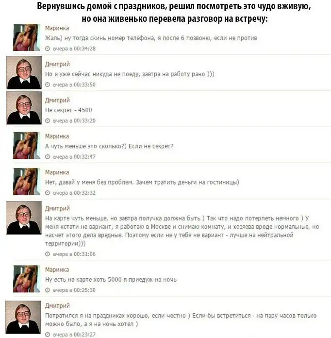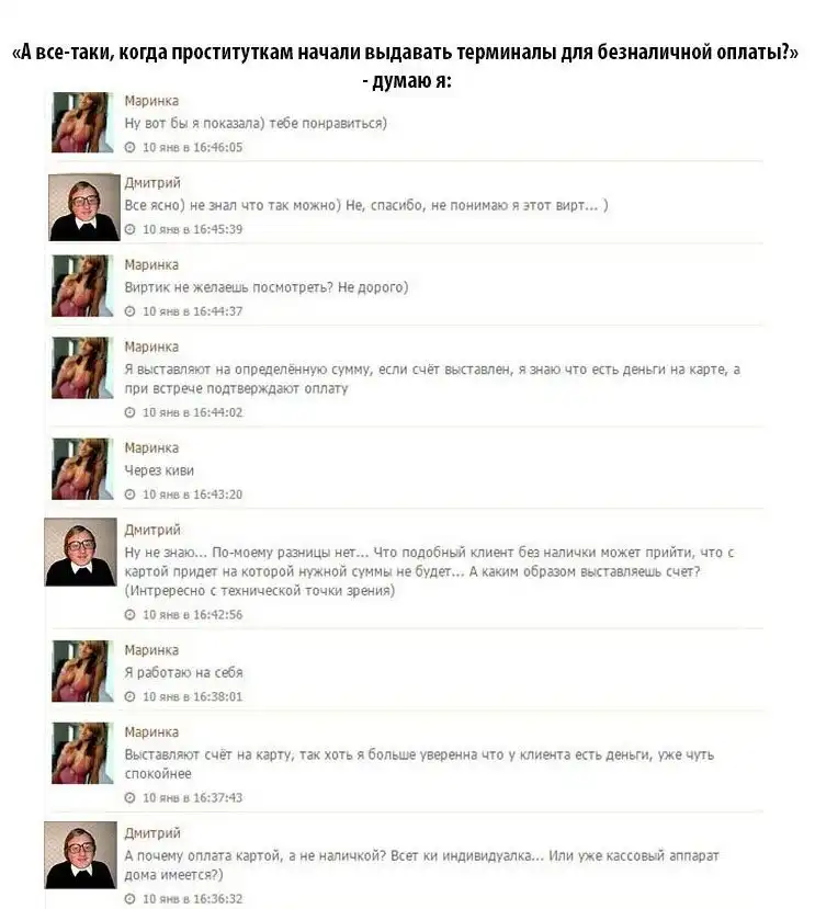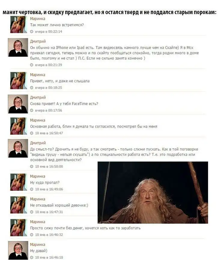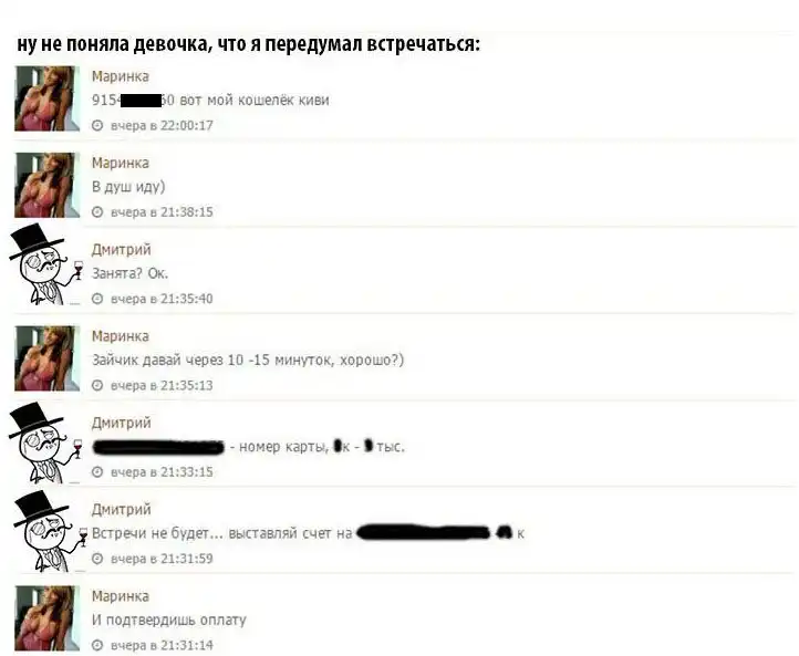 Пост о том, как смышленый 29-летний парень-девственник раскусил злой умысел мошенницы, которая под предлогом секса хотела кинуть его на деньги. Всю переписку, которую вы увидите ниже, на каждом скрине следует читать снизу вверх.