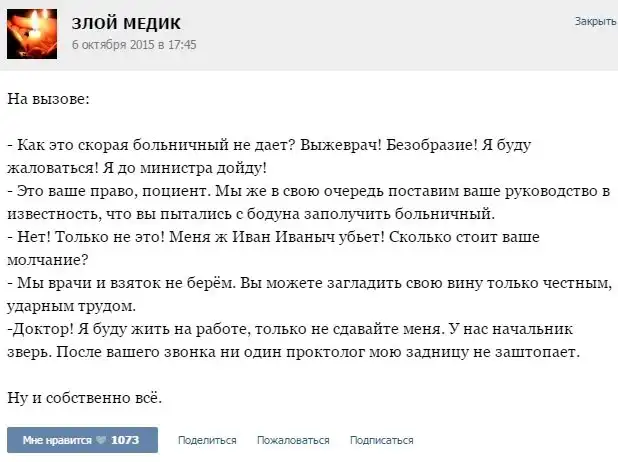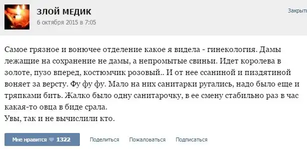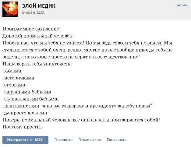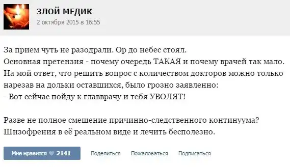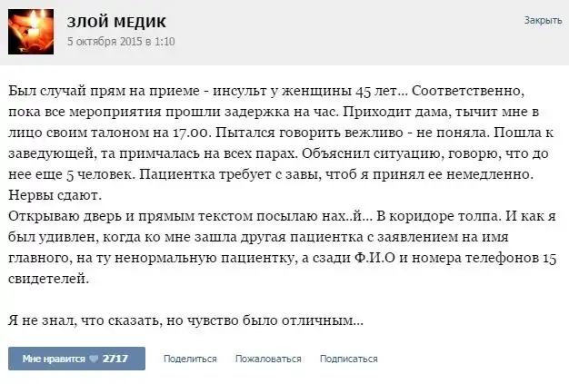 Последняя в подборке, такому я был свидетелем, когда ходил отмечаться в травму после перелома плеча. Очередь была с километр и рассасывалась медленно (травматолог не может автоматом принимать), но в большинстве своем пациенты не буянили и относились с пониманием, кроме некоторых е*анутых мамзелей бальзаковского возраста (даже бабульки терпеливо ждали). Суть в том что это единственна поликлиника в ближайших окрестностях с полноценным травмпунктом (с операционной, персоналом, но травматологов было мало), В 3-х соседних не то чтобы травмпункта, даже обычного травматолога не было, отсюда и очередь. Так эти е*бнутые курицы начали выступать и грозились накатить на всех жалобу и всех в асфальт закатать (дословная формулировка). В ответ на их выступления я им сказал, что если не нравится пи*дуйте в управу района в отдел здравоохранения и там излагайте свои претензии, так они наехали на меня и одна из них сымитировала обморок, а вторая вызвала ментов. Приехали менты и спросили, что случилось. Я достал телефон и включил запись диктофона, который предварительно включил. В итоге этих куриц менты уволокли за собой, что там дальше с ними стало я не в курсе.